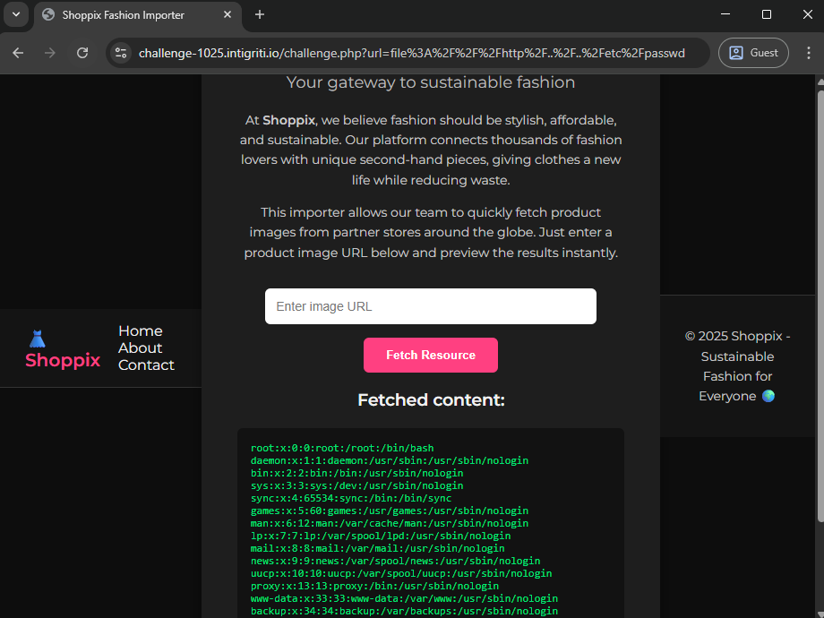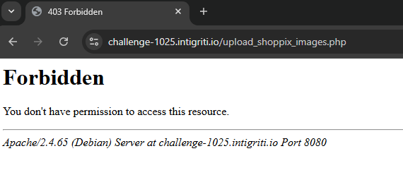 /var/www/htmland retrievedupload_shoppix_images.php:https://challenge-1025.intigriti.io/challenge.php?url=file:///http/../../var/www/html/upload_shoppix_images.php upload_shoppix_images.phpcontains a loose upload validation routine:if ($_SERVER['REQUEST_METHOD'] === 'POST') { $file = $_FILES['image']; $filename = $file['name']; $tmp = $file['tmp_name']; $mime = mime_content_type($tmp); if ( strpos($mime, "image/") === 0 && (stripos($filename, ".png") !== false || stripos($filename, ".jpg") !== false || stripos($filename, ".jpeg") !== false) ) { move_uploaded_file($tmp, "uploads/" . basename($filename)); echo "<p style='color:#00e676'>✅ File uploaded successfully to /uploads/ directory!</p>"; } else { echo "<p style='color:#ff5252'>❌ Invalid file format</p>"; } }