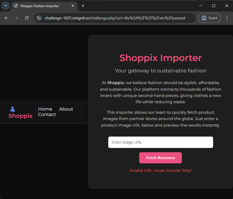 https://challenge-1025.intigriti.io/challenge.phpand observed input that performs server-side URL fetches (SSRF). - Tried using